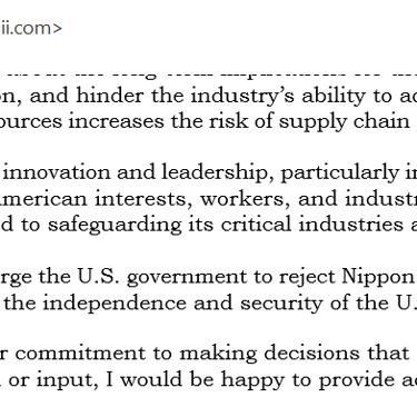 In light of the concerns outlined above, I strongly urge the U.S. government to reject Nippon Steel’s acquisition of the U.S. steel company. This decision would protect American workers, ensure the independence and security of the U.S. steel industry, and align with the principles of economic and industrial resilience.